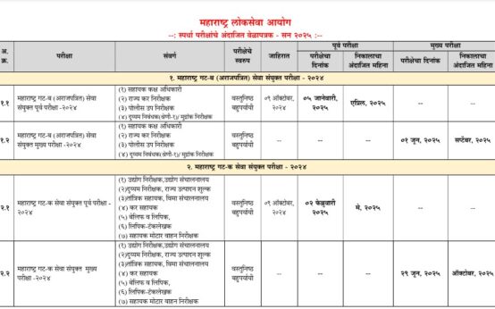महाराष्ट्र लोकसेवा आयोगमार्फत २०२५मध्ये होणाऱ्या स्पर्धा परिक्षांचे अंदाजित वेळापत्रक जाहीर Short Posts मुंबई/महाराष्ट्र 1 year ago 5 0 महाराष्ट्र लोकसेवा आयोगमार्फत २०२५मध्ये होणाऱ्या स्पर्धा परिक्षांचे अंदाजित वेळापत्रक जाहीर